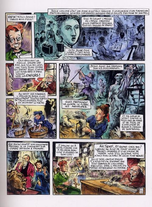 Indignez-vous !, disait l'autre. Car oui, difficile de refermer cet album sans ressentir un vif sentiment d'injustice envers une femme qui n'eut sans doute pas la reconnaissance légitime que son génie réclamait. Être femme et artiste aux débuts du siècle passé n'allait pas de soi... Après avoir maintes fois repoussé la lecture d'un titre qui semblait aussi fascinant que dérangeant, le verdict se révéla conforme : dense et prenante, cette redécouverte de la vie de Camille Claudel exige de son lecteur un véritable effort. Une épreuve de près d'une heure au moins, mais ô combien gratifiante ! Le scénario imaginé par Eric Liberge est celui d'un classique flashback, relevé des commentaires de son narrateur, Paul Claudel. Une forme sans surprise, et néanmoins réussie puisqu'il vous sera difficile de lâcher l'opus avant d'en finir. Quant aux peintures, signées Vincent Grave, elles participent activement de l'impression de marathon éprouvé. Denses, colorées et torturées, ses planches revendiquent clairement les mêmes originalité et liberté de ton que celles qu'espéraient son héroïne. Vraiment, cette œuvre publiée dans la collection 1000 feuilles ne pourra vous laisser de glace. En un temps où la parité s'affiche au gouvernement (mai 2012), convoquer culture et Histoire autour d'une figure si belle et fière n'est sans doute que justice. Et cela tout à l'honneur du 9ème art.