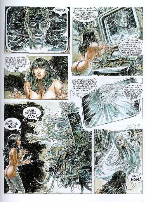 Druuna aperçoit un escalier au loin. Elle est sûre que la sortie tant recherchée se trouve tout en haut et qu'elle y verra son bien-aimé Schastar. Les marches sont nombreuses et la jeune femme, simplement vêtue de collants et d'une petite culotte, croise d'étranges individus au visage recouvert de vers. Elle se presse de poursuivre son ascension et tombe sur une porte verrouillée. À force de pousser, cette dernière s'ouvre. De l'autre côté, Druuna aperçoit une machine gigantesque dotée d'un grand écran. Sur celui-ci s'affiche les traits de Schastar. Il prétend être prisonnier et ne plus être que de l'énergie pure. Pourtant, quelques instants après, il s'extirpe de l'écran et peut enfin enlacer Druuna. Caresses et baisers s'enchaînent jusqu'à ce que la jeune femme sorte de son songe...