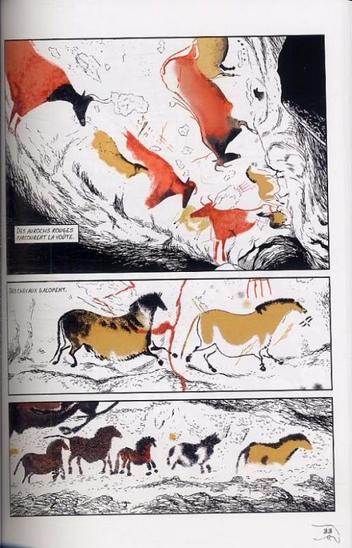 Véritable passionné d’art pariétal préhistorique, Eric le Brun a commencé dans la BD en mettant en scène un gentil héros muet pour les enfants, Ticayou… avant finalement de se consacrer à cette série de fascicules purement pédagogiques. Les époques concernées par ce second volet sont le Gravettien et le Solutréen (de -35000 à -20000 avant notre ère), dont le plus célèbre témoignage artistique qui nous soit parvenu est sans contexte la célèbre grotte de Lascaux. L’auteur retranscrit donc, à travers des planches de BD non-scénarisées mais didactiques le résultat d’années de voyages et de crobars en France, en Espagne et en Italie. De grottes ornées en trésors archéologiques, il a ainsi recopié, majoritairement en noir et blanc, en les rendant de manière le plus accessible possible, des dizaines de parois peintes, de statuettes sculptées, de fragments de bijoux ou d’outils taillées. Comme l’a justement souligné Pierre Bordage, il est fascinant et touchant qu’ « un homme ait pu peindre son désir, sa volonté de marquer une présence ». Parfaitement didactique dans le détail, l’exercice tourne toutefois au catalogue redondant dans sa globalité : aux mammouths dessinés, succèdent des mains aux « pochoirs », des cervidés, des aurochs… Quelques originalités sortent toutefois le lecteur d’une lecture monocorde : comme cette grotte immergée à 6 km de la côte provençale ; comme ce phallus, digne de nos tags urbains décérébrés ; comme ces mystérieux doigts manquants aux mains détourées dans les grottes de Gargas… Notons qu’un troisième fascicule devrait venir compléter la collection en s’intéressant à l’art au Magdalénien (-20000 ans).