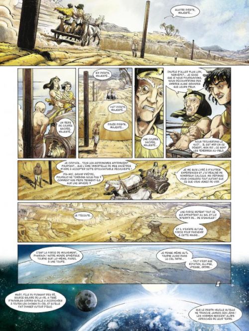 Après avoir scénarisé ensemble Panthéon, le tombeau des Dieux endormis, Didier Convard et Eric Adam remettent le couvert avec Le pendule de Foucault, les chroniques de Plateterre. Attention : il ne s’agit pas d’une adaptation du roman éponyme d’Umberto Eco, mais d’une histoire autour du véritable pendule de Foucault, une œuvre exposée au Musée des Arts et Métiers. Avec cet objet mythique, Léon Foucault mit en évidence la rotation de la Terre, en 1851. Il est considéré par certains fanatiques d’ésotérisme et d’occultisme de l’ouvrage, comme le seul et unique indicateur du point fixe de l’univers. A travers ce one shot, les deux auteurs nous expédient dans un monde où le dogme de « La Voie » prévaut. La science a disparu et tout tourne autour de cette religion qui prône l’obscurantisme. Mais les découvertes de Kunnskap vont changer la face de ce monde. La narration, bien qu’axée sur une thématique complexe, reste d’une grande fluidité. Dommage que la trame de fond utilise les mêmes artifices que Panthéon, à savoir la lutte un poil manichéenne entre deux mondes que tout oppose. Heureusement, tout est ici bien plus abouti. Fred Vignaux complète ce tableau avec son trait précis. Ses paysages détaillés sont somptueux, ses scènes d’action sont bien exécutées, son découpage très dynamique alternant plan large et gros plan font mouche. Bref, à défaut de laisser un souvenir impérissable, cet album se laisse lire. La faute peut-être à un développement en un seul tome… Un diptyque ou une trilogie aurait été sûrement plus adapté(e).