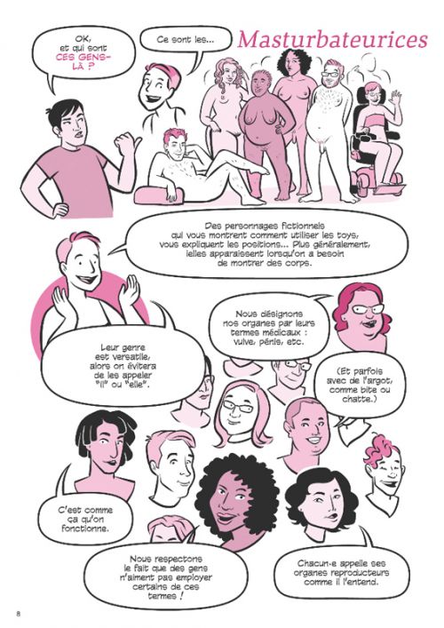 Erika Moen et Matthew Nolan sont des testeurs de sex-toys et ils nous livrent leurs sensations sur chaque produit qu’ils se sont infligé, en quelques planches BD. Une fois la description technique du produit réalisée, ces critiques de jouets pour adultes expliquent avec moult détails et sans tabou la manière dont il faut les utiliser pour donner du plaisir à son ou sa partenaire. Cette BD n’est pas uniquement un catalogue promotionnel de sex-toys. Les auteurs fournissent également des tutos sur certaines pratiques, comme la fellation, le triolisme ou encore des conseils sur des sujets plus variés comme l’herpès, l’avortement ou les selfies intimes. Les articles se veulent plutôt objectifs. Ce couple n’hésite pas à se montrer critique le cas échéant (ex : le site spécialisé AFF qui est une usine à cash). Les auteurs jouent la carte de l’ouverture (et pas que de l’entrecuisse) en élargissant au maximum (pas que les pénis) les publics : ils mettent en scène des handicapés, des LGBT et ont fait le choix de rédiger leurs articles en écriture inclusive (seuls les vegans ont été oubliés). Le dernier tiers de ce livre est une page blanche consacrée à des auteurs invités qui évoquent des sujets très variés autour du sexe, comme la pratique de l’ASMR pour exciter le partenaire, l’utilisation du kit anti-venin pour faire gonfler les têtons ou encore l’accident de sex-toy anal. Les dessins monochromes roses sont d’un réalisme très explicite afin de remplir leur fonction « pédagogique ».