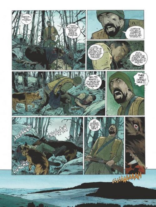 Dès le départ, les mots de Guy de Maupassant plantent le décor : « Les ténèbres étaient profondes. Je ne voyais rien devant moi, ni autour de moi et toute la branchure des arbres entre-choqués emplissait la nuit d’une rumeur incessante. Enfin, j’aperçus une lumière ». Les Tourbières noires sont une libre adaptation de la nouvelle La peur. Dans le texte originel, un homme raconte sur un bateau, les deux épisodes de sa vie où il a rencontré la peur, la vraie, celle qui glace le sang. Christophe Bec qui, pensait-on, avait rangé ses crayons de dessinateurs pour se consacrer aux scenarii, réinterprète ici le texte de l’auteur du Horla. C’est son grand retour en tant qu’auteur complet ! D’emblée, on est saisi par l’ambiance inquiétante qui règne sur ces terres hostiles chargées de mystères. Des lieux familiers, pour Bec, qu’il avait déjà exploitées pour son excellent diptyque Royal Aubrac. Une fois de plus, Bec capture l’attention avec ce huis clos se déroulant dans un gîte perdu au milieu de nulle part. Avec le jour qui tombe, les secrets des évènements passés remontent à la surface. La nuit les révèle au grand jour. Le dessin précis et minutieux, ultra-réaliste de Bec, retranscrit parfaitement cette atmosphère digne d’un thriller. Au fur et à mesure, la peur gagne… à qui la laisse entrer.