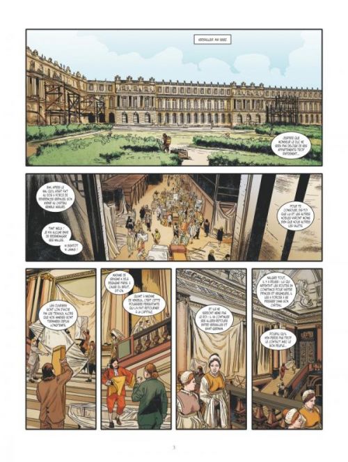 Le Roi-Soleil a eu le plus long règne de tous les rois de France : 72 ans ! Condenser son histoire n’était pas une mince affaire. Après un premier tome consacré à ses débuts en tant que Monarque, ce deuxième tome s’attache à revisiter la deuxième partie de son règne, plus controversée. Entre l’achèvement de la construction de Versailles et de Marly, la succession au trône d’Espagne, les guerres avec les pays voisins et les intrigues du palais, Louis XIV est largement occupé. D'autant plus que la colère populaire gagne du terrain, suite aux étés pourris, sécheresses et autres dîmes. Jean-David Morvan et Frédérique Voulyzé parviennent à réunir tous les évènements au forceps, au détriment de la fluidité narrative. Il est aussi important de lire le dossier de huit pages en fin d’album, mais avant d’entamer la lecture, pour ne pas décrocher. Les contraintes éditoriales ont sûrement contraints les auteurs à privilégier le diptyque au détriment d’une trilogie qui aurait été plus judicieuse. On aurait aimé qu’ils explorent davantage le goût de Louis XIV pour les arts (c’était un grand amateur d’opéra, de ballets et de théâtre). Mis à part ce petit détail, l’ensemble est fort intéressant et nous replonge dans l’histoire de ce monarque absolu qui était bien plus que l’initiateur de Versailles ou un infatigable coureur de jupons. Il était un roi très politique (qui a commis plusieurs erreurs, comme la révocation de l’Édit de Nantes, notamment). Le dessin de Renato Guedes et les couleurs de Walter accompagnent parfaitement ces textes. Des décors somptueux de Versailles au nombreux personnages emblématiques de la cour du Roi, il n’y a aucune fausse note, même si plus de mouvements auraient été les bienvenus. Férus d’Histoire ou collégiens, plongez dans ce diptyque consacré à Louis XIV, il saura vous combler !