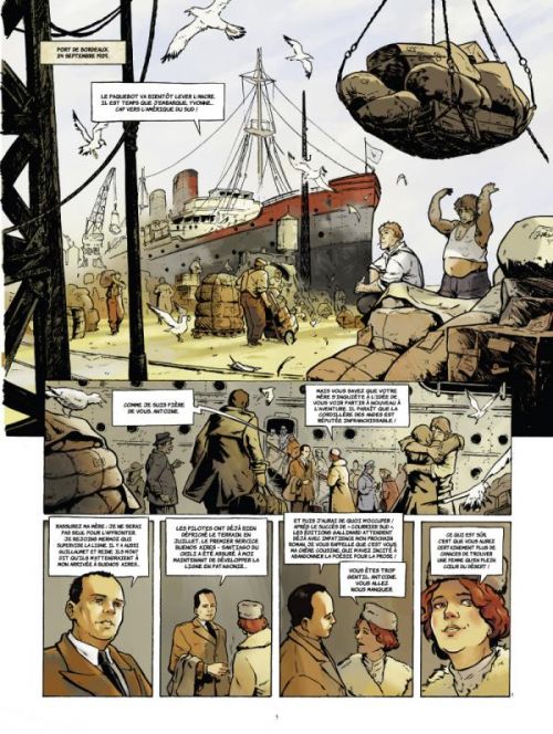 Antoine de Saint-Exupéry est surtout connu pour son œuvre littéraire (Courrier sud, Terre des hommes, le Petit prince, Vol de nuit, etc.). Ainsi que pour sa tragique disparition aux commandes de son P-38 au dessus de la Méditerranée en 1944. Ce qu’on sait moins de lui, c’est qu’entre 1926 et 1929 (période que couvre cet album), il a été pilote de transport de courrier entre Toulouse et le Sénégal pour la compagnie Latécoère (future Aéropostale) et qu’il a également passé 18 mois au Cap Juby (Maroc) pour améliorer les relations de la compagnie avec les dissidents maures et les espagnols. Isolé, c’est durant cette période que l’écrivain découvre la magie du désert et rencontre des tribus nomades. Autant d’expériences qui seront en partie fondatrice de son œuvre (de nombreux extraits de ses romans sont cités en guise de dialogues). Il croisera le chemin d’autres as de l’aviation qui ont marqué l’histoire de l’Aéropostale (Mermoz, Guillaumet, Lasalle, Reine…). L’abnégation, la responsabilité de la tâche à accomplir jusqu'au sacrifice de ces aventuriers qui ont contribué au rayonnement de la France, sont omniprésentes. Le travail sérieux de recherche sur les faits historiques effectué par les auteurs donne du crédit à cet album qui est d’ailleurs soutenu par la Fondation Saint-Exupéry (Association qui vient en aide à des jeunes en difficulté). Graphiquement, le trait moderne de Cédric Fernandez, qui n’en est pas à son galop d’essai dans la BD aéronautique historique, sert parfaitement ce type de récit.