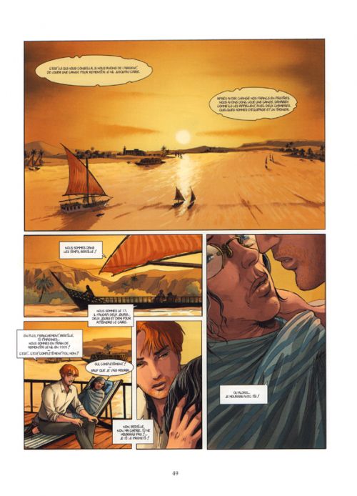 Débuté en 1997, la série ésotérique et sentimentale de Laurent Vicomte se termine enfin avec ce tome 4, soit 21 ans plus tard. Il faut dire qu’un gap insolite de près de 15 ans a séparé les deux premiers tomes, et que ce retard a nourri entre temps bien des discussions ! Mais les talents graphiques d’Anaïs Bernabé, qui aura de fait dessiné la moitié de la série en 3 ans, semblent avoir eu raison du perfectionnisme de Vicomte. Voilà donc la conclusion tant attendue de cette fable qui défie l’amour et la mort à travers le temps, sur fond d’ésotérisme égyptien. S’il fallait décliner de grandes questions de fond de cette histoire, ce serait : l’amour véritable peut-il transcender les rides ? Peut-on déclencher artificiellement l’amour ? La mort est-elle souhaitable lorsqu’on sait qu’il n’y a rien que le vide après ? La narration reprend là où nous avait abandonné le tome 3 : au suicide de Prudence dans les flammes de sa bibliothèque. Et la manipulation machiavélique de Sasmira pour séduire Stanislas reprend de plus belle, selon une trame tout de même très manichéenne, avec de nombreux moments de flottement et des impressions de redites. Cette princesse égyptienne est aussi belle que le fond de sa personnalité est laid… mais elle a des circonstances psychologiques atténuantes. Il en va un peu de même avec le dessin de Bernabé qui oscille entre une majorité de séquences soignées, fruit d’un important travail dans la finesse des visages et les détails, d’équilibre dans les cadrages et le découpage, et des cases secondaires délaissées (ex : problème de proportions dans l’avant-dernière case de la p.20 ; ou l’avion bâclé dans la dernière case de la p.61). De cette histoire, on ressort ravi qu’elle ait été convenablement achevée, mais perplexe quant au laps de temps délirant qu’il aura fallu pour ça.