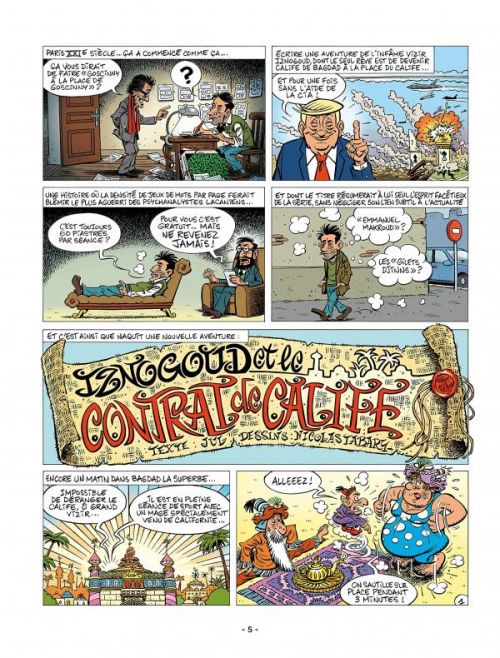 Ce nouvel album d’Iznogoud, 31éme de cette série culte jadis imaginée par René Goscinny et dessinée par Jean Tabary, semble faire un retour aux sources. En effet, les auteurs Jul, Laurent Vassilian et Olivier Andrieu proposent de revenir à un format plus traditionnel, celui d’histoires de huit planches, comme au début de la série par Goscinny. Ils proposent donc ici cinq historiettes, cinq aventures dans lesquelles Iznogoud ne poursuit encore et toujours qu’un seul objectif : devenir Calife à la place du Calife. Rien ne change donc pour lui, si ce n’est l'impératif de trouver de nouveaux stratagèmes pour élimer son Calife. Evidemment, Iznogoud toujours aussi méchant, haineux et irascible, manque à chaque fois son graal. Les jeux de mots utilisés à outrance, souvent lourds, voire très lourds, ne suffisent plus, voire agacent, à la lecture. L’humour mis en place ne convainc plus. Au dessin, Nicolas Tabary dessine ici ses dernières planches et passe le flambeau au dessinateur Elric, qui prend donc la relève. La transition ne se remarque guère, le dessin garde son dynamisme. Mais les scénarios, dont celui de la médiocre dernière aventure, manquent cruellement d’originalité et rappellent l'ultime aventure d’Astérix signée Uderzo...
