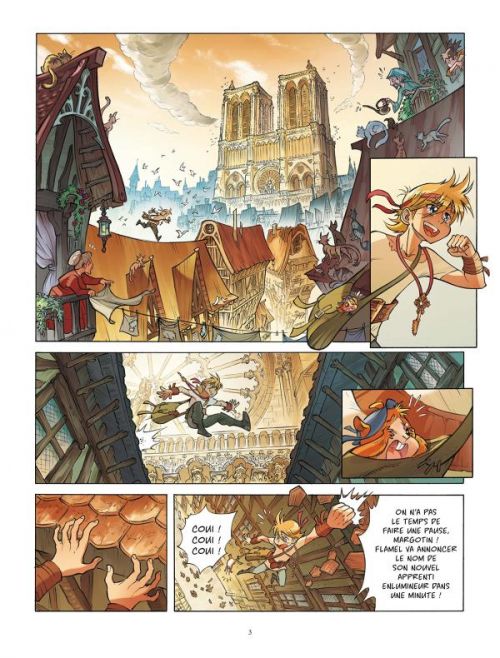 En pleine époque médiévale, dans le centre de Paris, l’intrépide Basile presse le pas. Accompagné de son hamster Margotin, il court sur les toits de la capitale. Il se dépêche, car le grand Flamel se prépare à annoncer le nom de son nouvel apprenti enlumineur. Celui-ci sort d’ailleurs de sa demeure et annonce devant un public aux aguets le nom de l’apprenti choisi : Basile. A cet instant, le jeune garçon atterrit devant le vieil homme. Il est fou de joie, et regarder avec des yeux pétillants la clé léguée par son père, qu’il tient autour de son cou. Sa mission commence immédiatement. Il prend place dans la salle où l’attend son nouveau bureau, mais Margotin renverse l’encre à sa disposition. Basile arpente la bâtisse, et rencontre une fille étrange, qui semble ne pas venir de la même planète. Le garçon continue son chemin et entre secrètement dans une pièce qui ressemble à un laboratoire, et où Flamel prépare un décoction. Pendant ce temps, une jeune femme se prosterne devant son maître. Elle indique qu’elle a retrouvé l’enfant et sa clé, et que celui-ci vient d’intégrer l’équipe de Flamel. Le livre et la clé seront bientôt réunis. Son maître s’énerve, mais semble affaiblit : Flamel ne doit pas mettre la main sur cette clé avant lui ! Il est probablement le plus grand savant de son époque, et les deux hommes recherchent le même pouvoir…