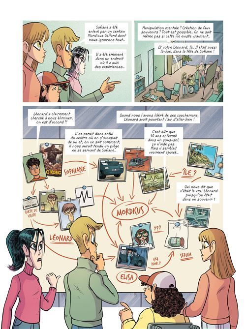 Les quatre explorateurs de la brigade des cauchemars font un point sur leur enquête au long cours concernant leur ennemi des limbes somatiques, Léonard. Ce dernier leur aurait tendu un piège en se servant de Sofiane, enlevé par un certain Mordicus Galfard. Il est certain qu’être resté enfermé 10 ans dans un laboratoire souterrain où il a servi de cobaye à diverses expériences et tortures psychiques, cela ne l’a pas apaisé… Ils suspectent cependant la laborantine Elisa de jouer un double jeu. Ils décident de la prendre en filature pour pouvoir aller fouiller chez elle à son insu. Au même moment, Albert et Alice, les parents scientifiques de Tristan (le jeune explorateur en fauteuil roulant) font eux aussi le point sur leurs recherches. Par-dessus tout, ils aimeraient pouvoir faire remarcher un jour leur fils. Albert a presque un plan technique, à base d’implants au cerveau stimulés… mais tout cela n’est pas trop éthique. Ce faisant, ils se promènent au bord d’une falaise sous la pluie et ils repèrent une jeune fille sur le point de se jeter dans le vide. Elle s’appelle Jane et elle est amnésique, complètement hagard…