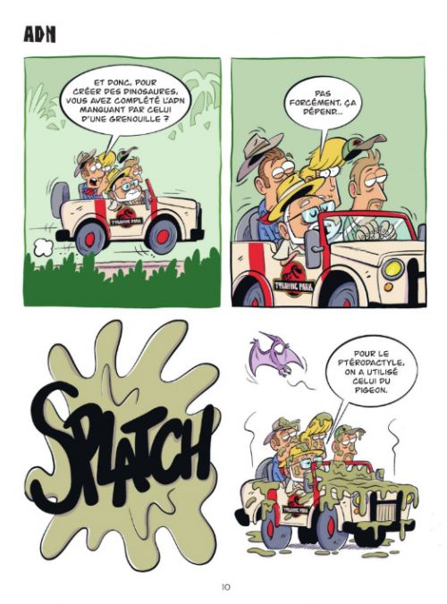 Tyrannic Park s’inscrit dans la longue série de parodies d’œuvres cultes, s’attaquant cette fois à Jurassic Park et Jurassic World. L’album au petit format souple reprend les grandes scènes des films en les détournant à travers des planches à gags qui s’enchaînent sans réel fil conducteur. Les blagues, souvent potaches, peinent à surprendre. Seules une ou deux parviennent à nous décrocher un léger sourire. Quelques références à d’autres œuvres de la culture populaire parsèment la lecture, mais elles restent plus discrètes qu’à l’accoutumée, ce qui évite au moins la surenchère habituelle du genre. Côté dessin, le style simple, caricatural et très coloré permet d’identifier sans mal les personnages emblématiques des films, mais le trait manque d’originalité et ne dégage pas de véritable charme. L’ensemble reste léger et accessible, notamment pour un jeune public, bien que la plupart n’aura sans doute jamais vu les films auxquels la BD rend hommage.