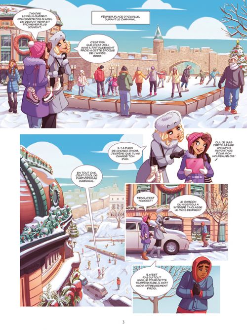 Cette histoire immerge ses jeunes lecteurs dans la culture canadienne, avec la tire d'érable, le grand froid, le traineau avec des chiens... Cela offre un dépaysement pour le lecteur français. Au scénario, Lisette Morival n'oublie pas non plus les références à la culture populaire (cf. La reine des neiges). Son adaptation du roman éponyme de Rose-Line Brasset séduira celles qui ne connaissent que l'autre version. On a envie de se laisser porter par cette gentillesse et cette bonne humeur de groupe. Ces bande d'amis n'hésitent pas à tendre la main vers ceux qui en ont besoin. Bien entendu, la scénariste intègre un personnage plus septique que les autres. Une manière de montrer qu'il existe aussi des opinions divergentes. Les réflexes racistes sont aussi des façons de penser courantes... Le récit se termine bien, avec deux fins heureuses qui permettent de clôturer la lecture avec le sourire. La dimension sociale avec les migrants montre que l'insertion est toujours possible. Les barrières sont avant tout celles que l'on se crée. Emilie Decrock apporte beaucoup de douceur à travers les traits ronds et les couleurs chaleureuses. Son travail reste dans l'esprit des précédents tomes. On referme l'ouvrage avec le sourire et l'envie de retrouver ces héros positifs.