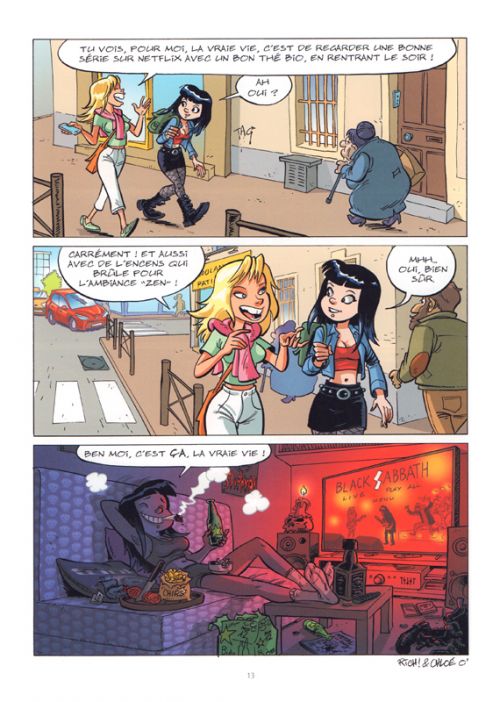 Avec cette bande dessinée, Chloé O’ (scénario) et Rich (dessins et scénario) ont décidé de faire connaître aux non-initiés la culture et même les multiples sous-cultures du merveilleux petit monde du metal et des aficionados. Pour ce faire, on va suivre toute une poignée de personnages – des metalleux, donc – dans des petites tranches de vie d’une page afin de mieux connaître leur univers à forts décibels et aux riffs énervés. Et même s’il est indéniable que les auteurs connaissent bien leur sujet (on sent qu’ils ont beaucoup traîné dans les petites salles de concert...) et que tous les clichés du monde du metal sont bien abordés, il faut bien avouer que les chutes des histoires ne sont malheureusement pas drôles du tout et pour tout dire frôlent parfois le ridicule ! En effet, les notes d’humour des dernières planches sont vraiment beaucoup trop simplistes et dénuées d’esprit (à titre d’exemples : les metalleux ont écrit une liste des affaire à emporter pour un festival et au final, s’aperçoivent que leurs valises sont trop petites. La petite fille d’un couple de metalleux est invitée à dormir chez une copine et écoute du Iron Maiden au lieu d’un CD de comptines...). Bref, ça ne vole pas haut du tout et ça dessert parfois même l’histoire. Cependant, tout n’est pas à jeter car les dessins de Rich sont plutôt bien faits et les fans de metal retrouveront ici et là des petits clins d’œil à leurs groupes favoris (Metallica, Twisted Sister, Venom, Korn, Death, Obituary...) et ce, même si les plus avertis noteront que le batteur d’AC/DC ne joue pas sur une double grosse caisse et que feu Malcolm Young jouait côté jardin de la scène et non côté cour ! Au final, même si Les Metalleux est une BD pétrie de bonnes intentions et concoctée par des passionnés, force est de constater que l’ensemble s’avère très inégal et passe à côté de son propos à cause d’un humour qui tombe très souvent à plat.