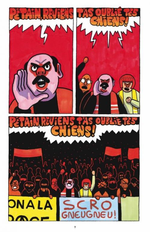 Le début en fanfare et en couleur, sur les trente premières pages, se fait façon Manga, avant de passer au noir et blanc. Il faut dire que ce personnage haut en couleur de Pétain le méritait. Ou plutôt méritait-il cet hommage posthume, tout en moquerie punk, allez savoir. En tout cas, Pierre Ferrero s'est attelé à ce scénario, depuis 2019, au long de pages éditées dans de petits fanzines auto produits. En y repensant, et tel que l'écrit dans sa longue postface Julien June Misserey, libraire et commissaire d'expositions, mais aussi créateur de l'association Chifoumi, (avec lequel l'auteur parcours l'hexagone dans le cadre d'ateliers de création), 2019, c'est surtout un contexte. Celui du moment où Pierre Ferrero, issu du collectif Arbitraire lyonnais, s'interroge sur le monde dans lequel il vit. Réchauffement climatique, affaire Benalla, Gilets jaunes, puis COVID 19, morts en cascade de migrants au large de nos côtes... Voilà le « pourquoi ». Quant au « comment », déjà évoqué avec la thématique fanzine, que l'on retrouve dans le trait souple et libre du noir et blanc du dessinateur - dans la veine d'un Max Radigues d'ailleurs, voire Riad Satouff sur certains personnages de flic boloss - il faut avouer que tout fonctionne à merveille. Le récit détonne par sa faculté à faire rire et grincer des dents (des défenses ?) en même temps. Les sujets abordés : racisme, police d'état, répression, migration, mais aussi : solidarité, résistance, patriotisme(s), sont lourds, et pourtant l'auteur parvient à les traiter avec humour, car il a choisi son camp. Celui de la défense des libertés, du rejet de l'obscurantisme et des vieilles peurs. C'est parce qu'il dépeint ce retour d'un vieux maréchal, adulé par des nostalgiques d'un passé révolu et fantasmé, et qu'il en fait un défouloir monstrueusement parodique, tout en décrivant des faits réels documentés, qu'il y parvient. Autant un livre pour rire que pour réfléchir !
