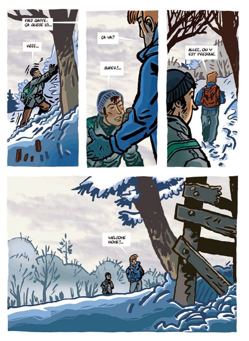 Bruel chanterait : « On s’était dit rendez-vous dans 10 ans »… Après l’incarcération d’un des trois amis de cette histoire tout à fait réaliste, l’heure des comptes est venue. Au pied de La cabane du titre, qui est leur QG secret de gamins, ils font une randonnée nostalgique et se remémorent les détails de l’histoire qui les a menés là, offrant au scénariste l’occasion de faire un ping-pong narratif entre présent et flashbacks. Y-a-t-il eu entourloupe ? Y-aura-t-il vengeance ? Vous ne le saurez qu’à la toute fin, après avoir découvert progressivement, au gré d’un suspens léger mais permanent, les tenants et les aboutissants de leur affaire. Il y a eu des morts, il y a du fric en jeu, il y en a un qui a morflé pour les autres… Il y a donc de quoi être tendu avec ce scénario ultra-réaliste signé Benjamin Fischer – tiens donc, le même prénom que l’un des héros… faut-il y voir un lien autobiographique ? Outre l’atmosphère sociale miséreuse parfaitement rendue, outre la juste peinture d’une amitié délitée comme le temps en impose à chacun, Fischer réussit son scénario parce qu’il n’essaie jamais d’être artificiellement spectaculaire et laisse apparaître les éléments avec une lenteur maîtrisée. Au dessin stylisé, Stibane utilise un trait gras, pas très loin de celui de Tronchet, par exemple, toujours parfaitement explicite. Avec ce one-shot en forme de thriller psychologique, la Boîte à Bulle commence donc plutôt bien l’année 2015…