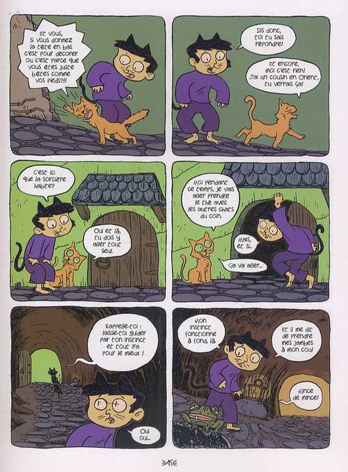 Recroquevillé sous son drap, l’enfant ne sait que faire. Il fait déjà noir et la lune brille dehors depuis un moment déjà. L’enfant semble apeuré et bien décider à s’enfuir loin, très loin de tous. Quand une voix l’interpelle. C’est Gaspard, son chat, qui a pris la parole. Il l’engage à sortir avec lui sur les toits en quête de croquettes. Y’a rien de meilleur pour un chat ! L’enfant amadoué se découvre. Apparaissent deux petites moustaches, des oreilles pointues et une queue. Oui, une vraie queue de chat qui lui sort du derrière ! L’enfant est un enfant-chat. Mais Gaspard le rassure : il ressemble à un super-héros. Convaincu, l’enfant se glisse dehors par la fenêtre à la suite de son animal. Garder son équilibre sur les toits n’est pas chose évidente. L’enfant-chat néophyte tombe parfois. C’est qu’il ressemble à un chat mais ce n’en est pas un ! Conseil de Gaspard : écouter son instinct. « Quand les moustaches passent, tout passe », comme il dit…
