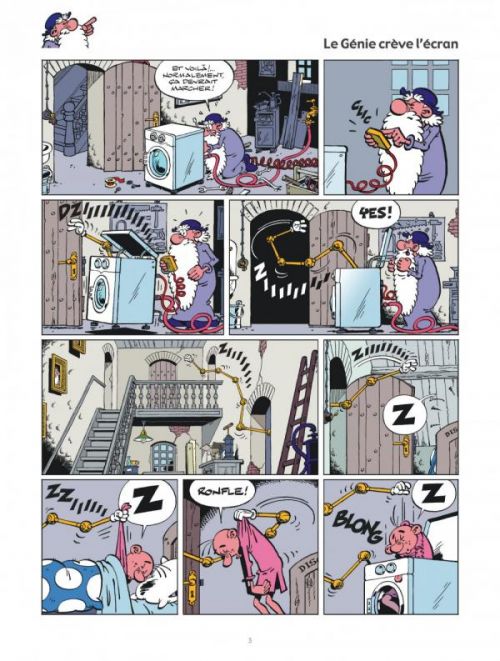 Un nouvel album de Léonard, c’est toujours autant d’inventions des plus saugrenues par un génie farfelu un poil mégalo. On retrouve les habituels anachronismes, des réveils en fanfare, des coups de marteaux ou des décharges de tromblon sur un disciple qui n’a pas inventé l’eau tiède. Cette fois-ci, Léonard va avoir des idées géniales comme la télévision 3D plus vraie que nature, la pilule d’immortalité ou encore le champagne. Il va également faire de nouvelles rencontres : les cousins idiots de Basile, la cousine américaine de Bernadette, une voyante pas très honnête... Bref, encore une galerie de personnages hauts en couleurs. Pour ce 46ème album, le duo Turk et Bob De Groot n’a pas changé la recette d’une série humoristique qui a fait ses preuves depuis plusieurs décennies, traversant les générations. Les gags ne sont pas d’une grande finesse, ni originaux, mais à dose modérée, ils ont le mérite de divertir. Une série d’une grande régularité, tant au dessin qu’au niveau des scénarios.
