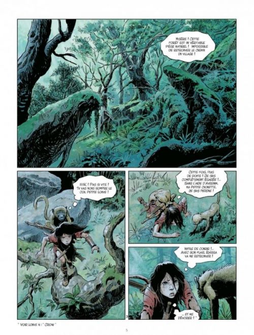 Rien ne va plus pour Louve depuis son retour au village, après avoir séjourné quelques temps chez le vil Mage Azzalepstön : les villageois voudraient la bannir ; son « double sauvage » lui mène la vie dure et sa mère, non contente de se faire courtiser par Lungden (qui lui a fait croire que Thorgal était mort), voudrait en faire une véritable petite femme d’intérieur. C’est pourquoi la jeune fille décide de quitter le village, tandis que sa mère déménage pour aller vivre avec Lungden (qui, cette fois, lui a fait croire que Louve avait également péri…). Cependant, dans la forêt, un bien plus grand danger que Lungden, les villageois ou sa mère, guette Louve : Crow, une guerrière sauvage et énigmatique cherche à lui mettre le grappin dessus. Très vite, Louve a compris qui était réellement Crow. Elle sait qu’elle a peu de chance de gagner la partie et il lui faut donc trouver un moyen de sauver sa peau. Et c’est en voyant un petit escargot se déplacer sur un tronc qu’elle a rapidement une idée de génie...