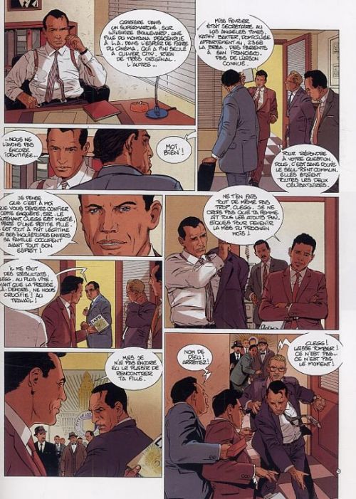 Cette nouvelle série policière emprunte ses inspirations à de nombreuses grandes figures connues du genre. Sorte de Dick Tracy romantique et solitaire, Clegg est l’archétype du flic des années noires du policier (il trompe d’ailleurs sa femme… pour le bien de l’enquête !). Face à lui, la belle cambrioleuse est la Catwoman des temps modernes : habillées en tenue noire et sexy, elle cache un lourd passé qui la force à utiliser des moyens illégaux pour s’en sortir. La ville est aussi un archétype de ce type de récit… Los Angeles, dans les années 60, abrite tous les clichés du bon polar : les belles femmes élancées, les Chevrolet rutilantes et chromées, le sexe et la drogue… L’univers typique de ces récits est parfaitement rendu dans cet album : la voix off de Viktor apporte un détachement cynique sur les évènements et le dessin est raffiné et subtil (surtout quand il s’agit de dessiner les femmes). Les personnages semblent tout droits sortis d’une revue de mode ou de photos glamours. L’histoire est elle-même sombre et prenante avec son lot de machinations et de rebondissements propres au genre. On ne s’ennuie pas à la lecture de cet épisode prenant et vitaminé. On peut toutefois regretter les grosses ficelles de l’intrigue qui rendent peu crédibles l’action. Le serial killer (dont l’imagination malsaine rappelle celle de la série Dexter) est menacé par une femme devenue… sourde et cambrioleuse professionnelle ! Malgré le savoir-faire de Stephen Desberg (le fameux scénariste de IRS ou Le scorpion…) qui nous plonge dans cette histoire, le point de départ est tout de même un peu gros. Malgré tout, c’est un plaisir d’être embarqué dans cette ambiance surchauffée des Etats-Unis, sombre à souhait et à l’intrigue prenante. Un bon polar de « divertissement », plein de stéréotypes qui ont bercé les amateurs de policier.