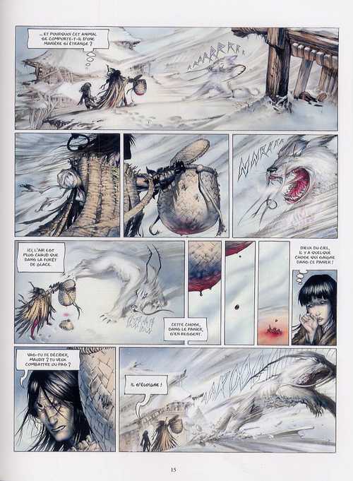 Ce n’est pas « à proprement parler » son premier galop d’essai mais, à l’instar de Hub (Okko), c’est un album d’aventure médiévale japonaise matinée de fantastique qui, à coup sûr, le fera connaître du public hexagonal. Graphiste confirmé (comics notamment) et professeur à l’Ecole internationale de Bande dessinée de Rome, Saverio Tenuta se pose d’emblée en maître du 9e art. Difficile de confier à un tiers le soin d’illustrer ses pensées ; difficile de se résoudre à illustrer les rêves d’un autre. Difficile aussi de partager son univers aux lecteurs : c’est le challenge que relève l’auteur complet. La ville qui parle au ciel n’offre pas « à proprement parler » un scénario révolutionnaire. L’intrigue exposée articule la thématique classique au pays du Soleil levant, la liberté contrainte de l’Homme face à sa destinée, et quelques éléments iconoclastes intéressants pour l’avenir (un héros manchot, un monde de glace, des katanas doués de volonté, etc…). Malgré une construction solide, un flash-back parfaitement filé, une narration « off » intimiste, il faut quelques pages au lecteur afin de pleinement s’investir dans une aventure plaisante au rythme crescendo. Non, « à proprement parler », la plus-value de la Légende des nuées écarlates réside en son esthétique simplement époustouflante. Envoûtant, le trait de l’Italien semble touché par la grâce ! Fin, virtuose, méticuleux et puissant à la fois, son talent éclate à la face dès les premières planches, au pire à la 15e (p.17, figurant un paysage enneigé baigné de lumière). La mise en couleur sublime, travaillée autour des blancs et rouges sang, renforce l’impression de contempler une estampe. Des encrages choisis et nuancés. « A proprement parler », une entrée en matière onirique esthétiquement magnifique...