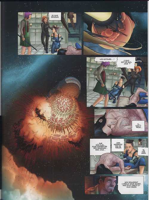 Messiah Complex apporte un peu de fraîcheur dans un panorama de SF en BD qui a tendance à abuser des sentiers battus. Le seul bémol que l’on peut émettre à l’égard de ce space opéra vient sans doute du manque d’originalité de son synopsis. En effet, une fois de plus, une prophétie et une élue sont à l’origine d’une saga tolkieno-starwarsienne, dans un contexte futuriste néanmoins séduisant. Car pour le reste, on se régale ! A la fin du tome 1, nous avions abandonné Miranda et Sonneillon en fâcheuse posture, en pleine chute libre… les choses repartent à 200 à l’heure, avec une accroche infernale (« Est-ce qu’on va mourir ? » « Oui. »). La suite se calme cependant et s’oriente plutôt vers un épisode de transition, servant essentiellement à consolider le décorum fantastique et conforter les lecteurs dans les fondamentaux de l’univers imaginé par la scénariste Alex de Campi. Mais qui dit transition ne dit pas forcément stagnation, à l’instar de l’Empire contre-attaque épisode plébiscité par les fans de la saga de George Lucas. Les personnages montrent une véritable profondeur psychologique, à l’image de Sonneillon, héros dépravé et tourmenté, ou du fils de l’empereur Constantin qui rejette sa condition, et sur lequel le focus est porté. Parions d’ailleurs que ce dernier ne devrait pas tarder à croiser la route de Miranda… Au dessin, Eduardo Ocaña livre une partition réaliste toujours très détaillée, empruntant un rythme impeccable. La moindre case fait l’objet de décors travaillés, grouillants de détails, et on ne compte plus les plans futuristes à grand spectacle (les hauteurs urbaines de la Nouvelle Rome, l’envol du vaisseau impérial Bucintoro, l’open space de pilotage, le palais de Silésie et ses souterrains…). En outre, les petites erreurs de découpage du tome 1 ont été gommées et ce second volet est parfaitement limpide. Espérons que cette double mise en bouche confirmera ces qualités dans de nombreux épisodes à venir…