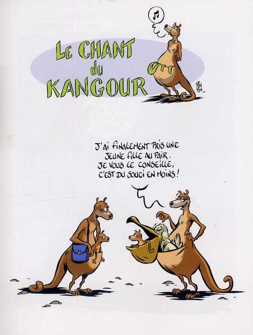 Le principe de cette série de dessins animaliers est désormais bien rodé : Nicolas Poupon prend les particularités physiques d’un animal donné et en extirpe le maximum d’effets comiques dans des situations parodiques éminemment adaptées, le tout avec des tronches pas croyables. Par exemple, puisque comme l’indique le titre, c’est de lui dont il est (un peu) question dans le titre de ce 3 recueil : le kangourou et sa célèbre poche. Le potentiel comique de cet attribut ventral est alors exploité dans tous ses détails (la poche capuche, la poche bordel, la fermeture éclair…). Il faut reconnaître à Poupon un talent certain pour trouver l’effet zygomatique idoine, notamment grâce à un sens de la tronche qui tue assez développé. Par exemple le caméléon daltonien ou l’autruche mâle timide ne manqueront pas de vous faire pouffer. Parfois, l’effet est plus sobre, mais le bestiaire a le mérite d’être à nouveau très varié. Pourtant, Poupon ne peut s’empêcher de faire à nouveau appel aux stars des précédents volumes : l’autruche et sa tête dans le trou, l’éléphant et sa trompe, le paresseux et son interminable sieste ou la tribu des clones pingouins. Ce faisant, Poupon s’inscrit quelque part entre les bonnes grosses vannes métaphysiques du Chat (de Geluck) et la verve animalière de Benjamin Rabier (célèbre humoriste animalier du début du XXe siècle, qui inventa notamment le personnage de Gédéon ou de la Vache qui rit®)…