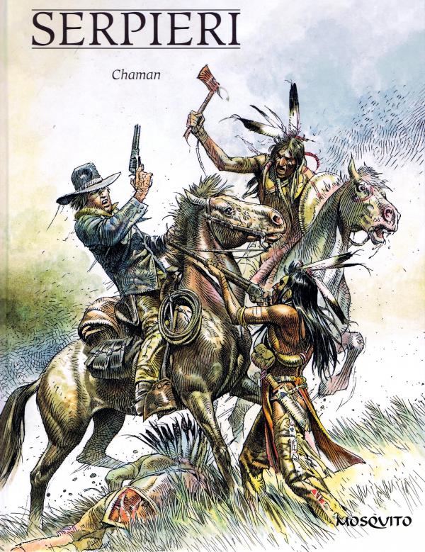 Avant d’affoler la phalocratosphère et devenir célèbre avec sa futuriste Druuna au fessier rebondi, Paolo Serpieri avait beaucoup donné de son talent réaliste au western. Ses histoires indiennes avaient déjà bénéficié d’un premier recueil chez Mosquito en septembre 2012 (Lakota)… L’éditeur alpin récidive aujourd’hui avec un second volume comprenant quatre histoires courtes nimbées d’ésotérisme. Vu la brièveté des récits, il n’est guère possible de s’immerger dans des intriques très complexes, ni de s’identifier à un héros précis… Néanmoins, se détache une véritable ambiance onirique autour de la thématique du Chaman, des puissances occultes, de l’indicible si cher à la culture amérindienne. Tantôt le destin d’un fusil semble obéir à une justice supérieure (Le bâton feu) ; tantôt un guerrier sorcier se livre à un impressionnant tour de magie en recrachant les balles reçues (L’homme médecine) ; tantôt le fantôme d’un chaman se venge de ses bourreaux (Chaman, la seule historiette en couleurs) ; tantôt un cow-boy, sous l’emprise de substances hallucinogènes, perd tous ses repères cartésiens. Ce qui impressionne au-delà de l’originalité des histoires, c’est le noir et blanc des plus somptueux de Serpieri. Dès la fin des années 70, son trait réaliste impressionne de virtuosité, aussi bien pour détailler, tel un ethnologue, avec un maximum d’authenticité, les parures complexes des indiens, leurs coutumes, leurs « postures sociales », que les vaste paysages de l’Ouest sauvage. Se dégage une force quasi documentaire de ces planches, réunies au sein d’une édition soignée, à la mesure du talent de l’artiste…