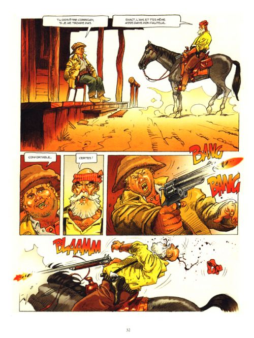 Avec ce one shot publié par les éditions Mosquito, Stefano Casini fait un glissando du registre de Cape et d’épée (cf. son précédent diptyque La lame et la croix) vers le Western. Et c’est une franche réussite ! Il ne révolutionne certes pas le genre, mais lui emprunte plutôt tous les ingrédients classiques pour en faire une aventure farouche et âpre, qui sent la poudre des flingues et la poussière du désert. Dans Mimbrenos, il y a en effet des pillards de banque avec de sales bobines, un shérif revanchard, des indiens sur le sentier de la guerre, un bon samaritain en tunique bleue, prompt à libérer son frère et à protéger une ancienne pute… Et surtout, une propension inhérente au registre, et donc congrue, à faire parler les armes plutôt que les mots. De fait, il y a un paquet des règlements de compte et de macchabées. Il ne manque que la partie de poker et la vieille mine abandonnées. Sur le plan graphique, Casini n’a aucune difficulté à mettre en scène les vastes paysages arides du Nouveau Mexique, les baraques en bois et les chevaux. Il immerge le tout dans des tonalités fortement ocre et chaudes, qui contrastent avec les obscures scènes nocturnes éclairées par des feux de camps ou des lampes à pétrole. « Tu dois être Corrigan, si je ne me trompe pas ? – Exact l’ami, et t’es même assis dans mon fauteuil ».