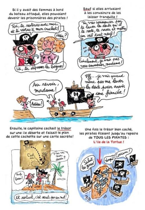 Les éditions Nathan BD continuent de mettre en avant les documentaires à travers le médium de la bande dessinée. Les dingos docus BD se dotent ainsi d'un nouveau sujet : les pirates. Comme dans le tome précédent consacré à l'Egypte, le jeune Archibald épaule le professeur Dudico, très maladroit, pour l'aider à reconstituer un exposé complet sur une thématique. L'ouvrage commence avec des illustrations BD colorées classiques ; puis dès les premières pages, on change de style graphique, pour passer à un style enfantin, et une colorisation au feutre. Cette transition est liée à la narration. Lorsque le jeune Archibald prend la parole pour reconstituer l'exposé, nous le voyons prendre vie sous nos yeux, comme si l'enfant était en train de le dessiner au fur et à mesure pour reconstituer le dossier du professeur. Un choix amusant, qui vient servir le sujet, et qui s'adapte à son jeune lectorat. La bande dessinée a une véritable vocation documentaire, puisqu'elle se présente comme un exposé complet sur le sujet des pirates. Le tout est traité avec humour et de nombreuses anecdotes, qui rendent l'apprentissage beaucoup moins fastidieux.