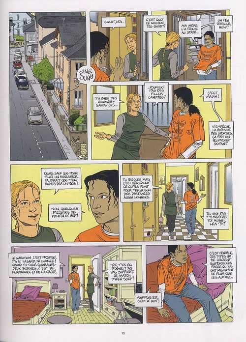 Le titre est à comprendre au sens propre comme au figuré. Une première fois édité chez Emmanuel Proust en 2008, le Marathon de Safia reparait en grand format chez Paquet à l'occasion des JO de 2024... dont c'était déjà le sujet sacrément prémonitoire ! Le récit propose le parcours difficile d’une jeune lycéenne aimant courir et rêvant d’or olympique. D’origine marocaine et de confession musulmane, son père refuse de la voir s’exhiber comme pourrait le faire un homme, oubliant aussi les champions de sa jeunesse, Mimoun et Bikila… Didier Quella-Guyot, professeur amoureux de bande dessinée, ouvrait à l'époque une collection Atmosphères sport... qui n'a pas eu grand avenir. Cette collection était néanmoins soutenue par le Ministère de la Jeunesse et des Sports et la chaîne Eurosport. En un volume, Quella-Guyot traite de sport, d’avenir et de la problématique féministe, quelques années avant que celle-ci prenne l'ampleur qu'on lui connait aujourd'hui. Emancipation féminine, mélange des cultures, héritages et modernité, rapports générationnels, etc. La liste est fournie. Le scénario est intelligent – voire trop lorsqu’il confond le champion Mimoun avec le vent du Sahara appelé « simoun » que peu doivent connaître. Chaque personnage témoigne d’une profondeur certaine et la sensibilité avec laquelle ils sont traités, rappelle celle de Tito sur la série Tendre banlieue. Loin des clichés, proche des réalités quotidiennes. Un regret ? L'album montre force et concision, mais il est un peu court pour traiter d’un sport qui exige tant d’efforts et de maturation. La course et le marathon sont trop absents des planches quand le football et les thématiques sociales vampirisent l’ensemble. Côté dessin, Sébastien Verdier livre un travail soigné, réaliste et documenté. On regrettera seulement les traits parfois très marqués des visages qui donnent, par exemple, à Safia la presque quarantaine quand elle n’en a que 26 (l’effort n’excuse pas tout !). On note enfin l'incroyable et aigre pressentiment des auteurs, concernant la féminisation du marathon face à l'endoctrinement religieux, au regard de la remise des médailles qui s'est authentiquement déroulée le 11 août 2024. La vainqueure Sifan Hassan qui court tête nue, portait pour cette occasion le hijab comme un manifeste politique...