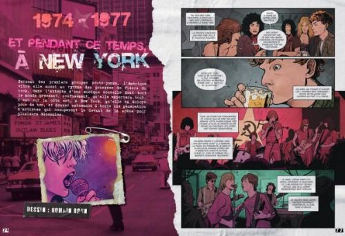 Aujourd'hui, si on vous dit Punk, vous pensez au chien qui va avec. Il n'y a pas très longtemps, on aurait pensé à une crête verte et un perfecto à piques sur les épaulettes et quelques épingles à nourrice. Certes, mais il ne faut oublier qu'avant tout, c'est une musique dérivée du Rock. Certains diront même qu'elle incarne totalement sa décadence. Peu importe finalement notre opinion sur le sujet, mais si vous voulez puiser une foule d'arguments et de connaissances pour nourrir le débat de la place du Punk dans l'histoire du Rock, cette BD est faite pour vous. Avec son découpage chronologique et thématique en 21 chapitres pour autant de dessinateurs (et encore d'autres qui se fendent d'une illustration qui accompagne les remarquables textes documentaires de Nicolas Finet), on remonte le court du temps et, bien sûr, on s'attarde souvent sur le sort des groupes phare du mouvement. La préhistoire américaine, le Pub Rock qui s'implante à Londres comme le terreau aussi pourri que les dents de Johnny Rotten et le son de basse de Sid Vicious et ce sont les Sex Pistols qui viennent marquer l'histoire du mouvement. L'histoire de très nombreuses formations forme la composition de ce livre. On va naturellement croiser les plus marquantes, comme les Clash, les Ramones, les Buzzcocks, Siuouxie & The Banshees, mais aussi de moins connues mais à la carrière sacrément riche, intéressante, engagée voire parfois cruelle (comme Sham 69, qui va splitter parce que des skin head deviennent leurs suiveurs alors qu'ils sont résolument de gauche). Enfin, le post-punk et, en quelque sorte, son héritage sont aussi évoqués, de Motorhead à Nirvana en passant par le mix Punk et Reggae, sans oublier non plus les formations françaises des années 80/90 comme les Bérus ou Ludwig Von 88. Bref, y'a de quoi secouer la tête avec ce livre, qui pousse le vice jusqu'à être imprimé de manière à faire croire qu'il y a des salissures sur les pages et que ses coins sont abîmés. Faites en sorte qu'il ait un beau futur devant lui, pour prendre le contrepied du dicton Punk.