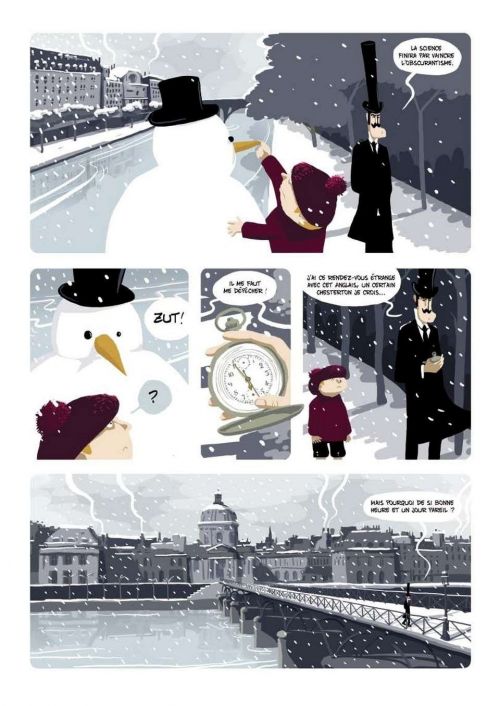 Voici une intrigue policière peu banale. L’histoire est très surprenante et le lecteur découvre un univers unique. Ici, tout y est déstabilisant : l’énigme est totalement loufoque et bien malin qui trouvera la clef du mystère (même le commissaire Clé ne l’aura pas !). Le récit bascule petit à petit dans l’irrationnel, en dépit de personnages principaux cartésiens jusqu’au bout des ongles. Savant mélange de policier, d’énigme et de science-fiction à la Jules Verne ou à la H.G. Wells : une sorte de merveilleux scientifique imprégné de Sherlock Holmes. L’originalité vient également des dialogues : les conversations sont prétextes à créer des situations loufoques entre des personnages fantasques. L’absurde est constant dans cette œuvre et détruit toutes les normes, un peu comme si le réel se déformait progressivement devant une affaire irrationnelle. Les réflexions scientifiques du commissaire sont autant de tentatives désespérées de garder le cap de la réalité devant le paranormal. Le dessin est aussi un exotisme dans cet album : à l’image de cette ambivalence entre réel et surnaturel, le graphisme de Sylvain Dorange est original et créatif. Les visages sont à la fois géométriques et carrés (le rationnel), mais aussi déformés, à la limite du grotesque parfois, sans compter le découpage des cases qui décloisonne les planches (l’irrationnel). Le travail des couleurs est superbe, sans compter les décors : au gré des pas du commissaire, on reconnaît avec émerveillement quelques monuments de Paris. A l’image de toute l’œuvre, la fin déroute et ouvre de belles perspectives. Bref, cette œuvre fantasque et fantastique, où le policier côtoie le surnaturel et l’absurde, est unique.