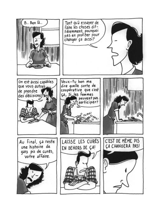 Francis Desharnais est un auteur ayant déjà produit 10 livres, dont 6 aux éditions québécoises Pow Pow lorsqu'il publie La Petite Russie. Se basant sur le témoignage de son grand-père, Guyenne, vingt ans sous le régime coopératif... et après, paru en 1983, il souhaite rendre hommage à ces colons qui ont cru à un nouveau modèle de société. Il offre aussi au passage une Mémoire à sa famille. Il est épaulé en cela par les témoignages de sa tante Yolande, très engagée alors au sein de la communauté, surtout après le départ de ses grands-parents, et entre autre pour la reconnaissance des femmes. Desharnais a aussi bénéficié des conseils de Frédéric Limieux, historien, tandis qu'une résidence d'écriture à Bordeaux, grâce à l'association 9-33, et au Conseil des arts du Canada lui ont permis de réaliser cet ouvrage. Très informative et superbement menée, cette aventure biographique donne un aperçu assez juste des romans graphiques que l'on peut trouver dans le catalogue des éditions Pow Pow : un ton juste, un dessin simple noir et blanc, fluide et agréable, et, bien souvent, des tranches de vie exceptionnelles. La spécificité du langage de nos voisins québécois rajoute aussi au plaisir que l'on peut trouver à sa lecture. Mais l'essentiel, pour le coup, se trouve ailleurs, même si un glossaire et une bibliographie/filmographie sont inclus en fin de livre. Cet éditeur distribué dans les pays francophones depuis 2016 ne restera pas petit en France bien longtemps, on peut l'espérer.