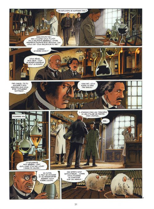 Ce premier tome des Guerres d’Albert Einstein est bizarrement sorti dans la plus grande confidentialité en octobre 2019. Il est cependant remis en avant avec la parution du second volet du diptyque, en octobre 2020. Au scénario, le journaliste François de Closets s’est adjoint les hautes compétences narratives de l’incontournable Corbeyran. L’objectif : creuser la personnalité de ce génie scientifique du XXème siècle, plutôt sous son angle civil, c’est-à-dire sans encombrer le lecteur de théories physiques et d’équations mathématiques que peu sont à-même de saisir. L’important est bien de percer la personnalité d’Albert Einstein, sans les découvertes duquel notre XXIème siècle serait tout autre. Ce premier tome décrit certes un savant travailleur, intellectuellement brillant, fondamentalement pacifiste, mais aussi… infect envers son épouse. Son époque allemande s’accompagnera d’ailleurs d’une répudiation. Pour autant, ce premier tome fait presque plus la part-belle à son ami chimiste Fritz Haber (qui dispose par ailleurs de sa propre série BD, par David Vandermeulen). Ami, mais néanmoins némésis, puisque Haber est un va-t-en-guerre, qui mettra tout son savoir au service de l’invention et de l’utilisation de l’abominable gaz moutarde. L’ensemble est très sérieusement et avantageusement mis en scène et dessiné via un style réaliste encré par Eric Chabbert. Ses cases géantes de mises en contextes, souvent des plans généraux en plongée, sont splendides.