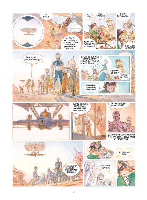 Alex Alice poursuit sa série fantastique entre Mars et la Terre. Son épopée céleste se situe dans un XIXème siècle un peu différent du notre, car les hommes peuvent voyager dans l’espace grâce à l’éther. Les empires profitent de cette occasion pour lancer des colonies sur d’autres planètes, comme Vénus ou Mars. Evidemment, les belliqueux prussiens d’Alex Alice envahissent Mars, martyrisent les « martiaux » et souhaitent s’approprier tous leurs secrets. Heureusement, Séraphin et ses amis qui voyagent à bord de l’Ethernef le Schwanstern viennent en secours aux martiaux alors qu’ils sont à la recherche du roi du château des étoiles. S’ensuit donc une course-contre-la-montre dans laquelle Alex Alice lance ses héros au secours de Mars... Ils devront revenir sur Terre pour trouver de l’aide auprès de Napoléon III. Hélas, rien n'est simple pour qui connaît le secret de l’éther. Comme pour les précédents tomes, Alex Alice découpe son album en trois chapitres . La qualité graphique est excellente, le style en place assure une parfaite maîtrise du récit et de son découpage. Le suspense demeure, la fin de l’album laisse présager de nombreux rebondissements à venir et Alex Alice n’en a pas encore fini de nous faire voyager dans son univers fantastique de planètes habitées et surprenantes.