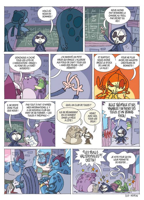 Au rayon BD jeunesse rigolote, cette nouvelle série ne manque pas de marquer d’entrée quelques points. En cause : un dessin caricatural bien pêchu (allez ! on oublie les couleurs un brin fadasses pour cette fois…), hyper lisible et un trio de personnages qui manie la loose avec brio. Un parfait décalage quand on sait qu’au final, le propos de cette saga humoristique est de nous faire vivre l’apprentissage d’un futur gros méchant. Un de ceux qui veut, sans rougir (‘toute façon il porte un masque en permanence), se hisser au rang d’un Sauron de Mordor, d’un Skeletor ou de tout autre Maître du Mal absolu. D’autant que, dans l’univers médiéval où notre arpète patauge, le trône du gros vilain est vacant depuis plus de 200 ans. On s’amusera donc, au rythme d’un jeu de gag-planche, à suivre le joli panel de déconvenues de notre terreur en devenir. Recherche d’une résidence austère et maléfique, plan pour dominer le monde, élevage de dragon ou enlèvement de princesse… tout est là pour mettre des poignées de sables dans les rouages de son ascension. Surtout, le recrutement de deux (autres) bras cassés pour « effroyables » suppôts scellera définitivement son sort en une scoumoune de haute volée. Et encore… la dernière planche semble tisonner le pire à venir. Rythmé par d’impeccables dialogues, mélangeant avec malice anachronismes judicieux et ressorts traditionnels du petit monde de l’heroïc-fantasy, l’exercice offre un incroyable moment de détente pour petits et grands. L’association des 3 personnages principaux est particulièrement efficace et un offre un large potentiel. A suivre, donc…