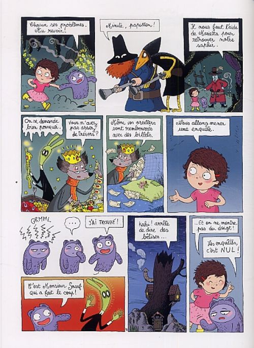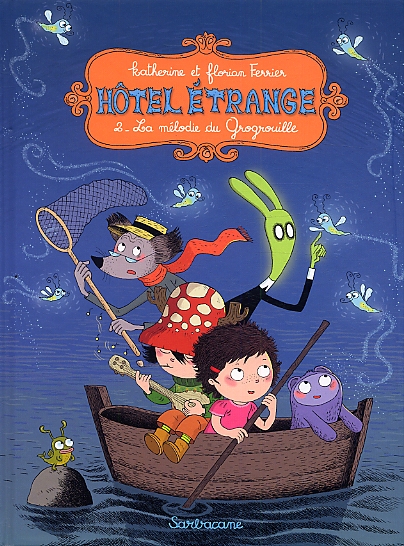 Copieusement mis en place par un premier album rond et pétillant, l’univers d’Hôtel étrange et sa kyrielle de personnages, aussi bigarrés qu’attachants, n’avaient pas tardé à taper dans les mirettes des plus petits. Retour festif et gagnant de la petite bande de Marietta (c’est elle qui tient le fameux Hôtel) pour une deuxiéme aventure sans temps mort ayant pour centre les préparatifs de la fête de la musique, été oblige. Et qui dit préparatifs invite à fainéantise notre inénarrable bestiole à poils violets, Kaki, ou convoque catastrophes à gogo. Voire même, pour pimenter la chose, un gros monstre pleurnichard, un colossal diamant volé et pourquoi pas un trio de brigands prêts à tout… Au final, de jolies surprises au tempo, du tout-est-bien-qui-finit-en-musique-et-chansons. Et décliné avec la science du rigolo, servi par un vocabulaire inventif et imagé. En sus, des protagonistes principaux parfaitement ciselés, dont les défauts et qualités complémentaires permettront à chacun des lecteurs de s’identifier. Bref, un chouette univers qui n’a pour seule limite l’âge de son lectorat, mais qui, du dessin au scénario efficaces, empile qualités et bonnes intentions. A faire découvrir rapido pour voir nos petites têtes brunes et blondes sautiller à la présentation d’une nouvelle friandise dont elles peuvent abuser à volonté.