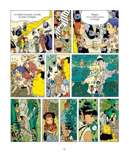 Ce second tome de la trilogie jeunesse est aussi palpitant que le premier ! Nous retrouvons notre héroïne Magda, droite dans ses bottes, maladroite et passionnée, qui va devoir continuer la compétition culinaire, en espérant aller jusqu'au bout. Mais les épreuves vont devenir de plus en plus complexes, et les concurrents seront redoutables. En plus, elle va devoir affronter son ami, faire face à la solitude et aux déceptions. Cette nouvelle aventure est pleine de péripéties, on ne s'ennuie jamais ! Les personnages sont creusés et attachants. On sait que des choses dangereuses se trament, que chacun garde ses secrets, et petit à petit, on lève le voile. Le scénario réussit à aborder une pluralité de thématiques modernes, sans perdre le lecteur : crise écologique, destruction des espèces animales et végétales par les Hommes, enjeux de la télévision et des réseaux sociaux, dépassement de soi... Graphiquement, l'album reprend les mêmes codes que le premier volume. Il y a de l'audace et une liberté dans le trait et la colorisation. Certes, ce n'est pas « parfait », mais nous comprenons toutes les intentions, et c'est ce qui fait véritablement le charme de chaque case. La bande dessinée, à la pagination plus importante qu'un album jeunesse classique, est chapitrée, ce qui permet au lectorat de faire des pauses cohérentes avant de reprendre le cours de l'histoire. Cette série se démarque du reste de la production et apporte un vent de fraîcheur sur l'édition jeunesse en BD.