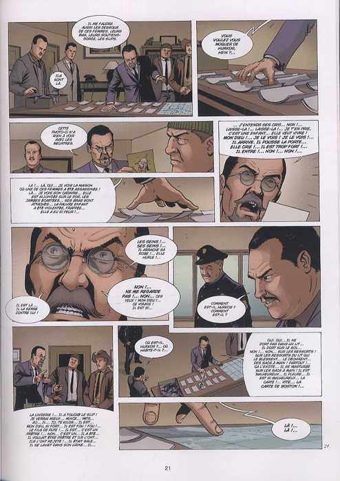 L’étrangleur de Boston est le troisième Serial-killer bénéficiant d’une biographie en BD, au sein de la collection éponyme. Au palmarès de ce tueur en série authentique, 13 femmes étranglées dans la ville de Boston, entre 1962 et 1964. L’enquête se révèle ici extrêmement classique dans sa forme narrative : un serial-killer sévit, la presse se déchaine, les policiers patinent un peu et finissent par le coincer, fin des hostilités. Il s’agissait d’un simple père de famille, d’apparence normale, mais schizophrène souffrant d’un réel dédoublement de personnalité. Notons au passage qu’il n’a en aucun cas pu inspirer Hitchcock pour son film Psychose, sorti bien avant le premier crime, en 1960. La nouveauté vient cette fois du nom du scénariste, Elie Chouraqui, qu’on a d’ordinaire plus l’habitude de croiser à travers le 7e art que via le 9e. L’écrivain-acteur-producteur-metteur-en-scène a pourtant déjà scénarisé (déjà chez Soleil) l’adaptation BD de sa propre comédie musicale Spartacus le gladiateur. Le dessin est quant à lui réalisé avec professionnalisme et maîtrise par Serge Fino, serial-dessinateur de chez Soleil, auquel il manque toujours un soupçon de personnalité. Ses cadrages et son coup de crayon réaliste, tous deux impeccables, se révèlent appropriés – quoique très (trop ?) « propre » – pour illustrer ce genre de récit. En effet, une petite touche de « trashage » (trashitude ?) aurait peut-être été bienvenue, pour un sujet aussi sordide…
