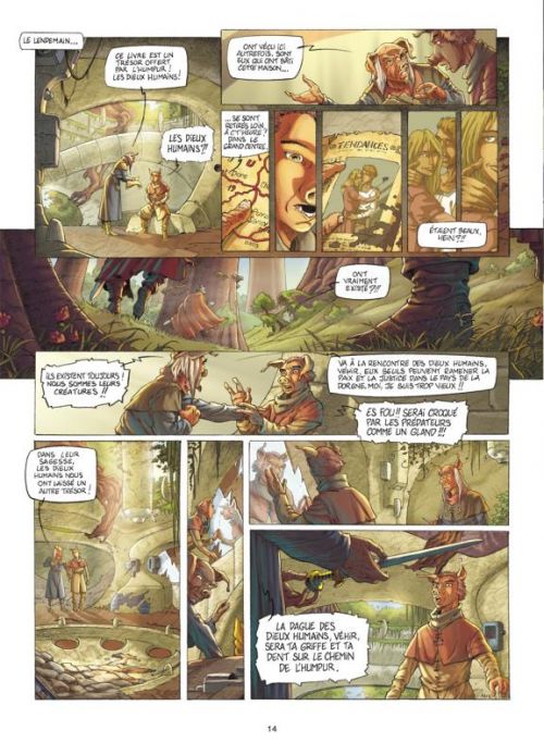 Pas facile du tout de transcrire en 48 pages un univers complexe et fourmillant de détails, regroupant des créatures humaines aux têtes animales au cœur d'un monde futuriste retourné dans une forme de moyen âge. Le récit de Pierre Bordage mériterait de longues séquences de mise en place pour mettre en valeur le foisonnement de sa création. Des séquences quotidiennes qui nous immergeraient dans ce futur où les créatures d'apparences humaines se rapprochent de l'animal, auquel ils commencent à ressembler physiquement. L'auteur de SF, qui scénarise lui-même l'adaptation de son roman, a semble-t-il choisi de faire tenir la première moitié de son histoire en un seul album, ce qui en rend la lecture plutôt frustrante. Les évènements s'enchaînent très vite, trop vite pour qu'on réalise ce qui est en train d'arriver à Véhir. La langue particulière des personnages de l'album, sorte de français médiéval aux expressions désuètes, est de son côté envahissante, forçant le lecteur à une gymnastique de compréhension qui l'empêche concrètement d'oublier qu'il est en train de lire. La version roman des Fables de l'Humpur (comprendre « homme pur »), qui insère ces dialogues au milieu de pages narratives en français « normal », est forcément plus équilibrée. Bordage considère visiblement que les décors des planches dessinées suffisent pour remplacer les descriptions des pages d'un livre, ce qui donne des enchaînements complexes, des cases où il se passe des choses dont l'importance est difficile à mesurer. Le dessinateur Olivier Roman se bat avec ces contraintes, sans toujours parvenir à nous tirer d'affaire, même s'il livre de très belles images de ce monde imaginaire. Il résulte de tout cela une entrée en matière foisonnante, mais qui manque de l'expérience d'un gourou raconteur d'histoires en BD. Une preuve évidente que la technique narrative en BD est un art à part entière. Une quête initiatique pour Pierre Bordage, en quelque sorte...