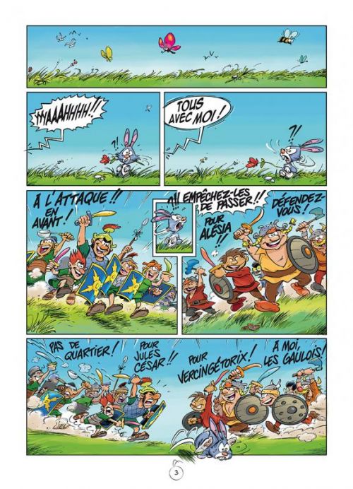 Les enfants reconstituent la bataille des gaulois contre les romains. Ils sont déguisés et simulent les combats durant la bataille d’Alésia. Maestro les contraint à une pause et ensemble, ils profitent de l’occasion pour remettre les évènements historiques à leur place. Il revient sur la période de moins 52 avant JC, époque durant laquelle Jules César contrôlait une grande partie de la Gaule. Alésia est encerclée depuis des mois par les troupes romaines. Vercingétorix n’a plus le choix, il doit se rendre afin d’éviter la famine à son peuple. Il se rend devant César et jette ses armes à ses pieds. Cette brillante victoire va stimuler l’ambition de César qui ne verra plus de limite à son pouvoir. Il franchit le Rubicon avec son armée et rentre en triomphe dans les rues de Rome. César assure au peuple de Rome du pain et des jeux. Il fait bâtir deux théâtres en hémicycles accolés l’un à l’autre. Les romains y viennent nombreux et sur un signe de César, les deux énormes édifices pivotent afin de devenir un amphithéâtre. Cette innovation va faire date et se développer par la suite dans tout l’empire…