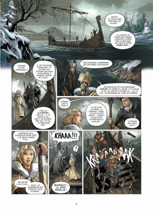 C’est une fois encore au rythme de plusieurs récits parallèles – entrelacés avec plus ou moins d’habilité – que Nicolas Jarry confie la trame de ce nouvel épisode. En jeu : la préservation des Neuf Mondes, dont la stabilité, jadis assurée par l’arbre Ygdrasil, véritable pilier des univers, est lourdement menacée depuis qu’a eu lieu le douloureux Ragnarök (deux siècles auparavant). Fimbulvetr ou Grand hiver pointe en effet à nouveau le bout de son museau congelé, accompagné de sa horde de représentants peu engageants et prêts à semer le chaos au Mannheim, la terre des Hommes. Reste néanmoins l’espoir. Celui justement mis en scène par ce découpage fragmenté en 3 mouvements et qui fait s’animer : Yngwild d’un côté, le roi Elfe Iduril et sa magicienne d’un autre, et enfin le Centurion Phocas, rejeton courageux de l’Empire romain d’Orient. Tous, et pour des raisons aussi complémentaires que différentes (l’épée de Siegfried, la protection de descendants d’Odin, l’appui de l’Empire romain) ont leur rôle à jouer dans la conservation du précieux équilibre et pour faire échouer tout basculement. Tous sont observés dans l’ombre par Odin qui n’intervient plus directement pour tenter d’infléchir leurs destinées mais qui tente au moins d’assurer leur protection… Plutôt maîtrisé, l’exercice garde sa force divertissante, en particulier pour les amateurs de la série. Intelligemment, le scénario cisèle les rebondissements, use de la machinerie mythologie-celtique avec panache (mais avec le défaut de s’adresser surtout à des connaisseurs) et parsème régulièrement sa trame d’action. Surtout, il s’attache les services d’un panel de protagonistes aux contours à la fois attachants et intrigants. Les seuls défauts résident dans une absence manifeste d’originalité et une avancée dans « l’intrigue » de fond à petits pas (on en est toujours un peu au même endroit que dans le tome précédent). Bref, pas de quoi révolutionner le genre ou la série, mais pas de quoi bouder son plaisir non plus, notamment en raison d'un dessin toujours aussi bien balancé.