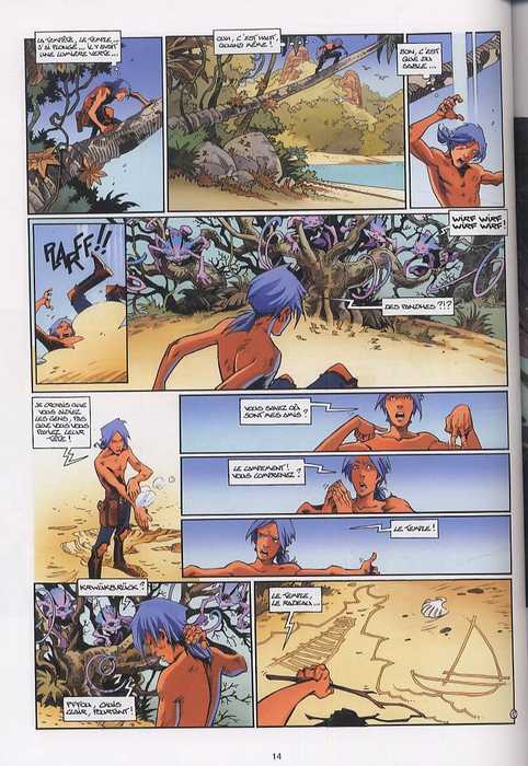 Il y a le film pop-corn et, à l’instar de ces productions pour teenagers, la BD chewing-gum dont Les Naufragés d’Ythaq font incontestablement partie. Même si ce type de sucrerie n’a rien de comparable avec les mets les plus raffinés, il remplit parfaitement le rôle pour lequel il a été conçu : coupe-faim et rafraichissant. Aussi, il ne faut pas se priver de mâcher à loisir les aventures saptio-fantasy de Granite, Callista, Narvrath et consorts, pris dans le tourbillon d’un bien mystérieux jeu. Inventif et plutôt habile dans l’art d’ouvrir son scénario, Christophe Arleston s’amuse à nous mener par le bout du nez : après une introduction plutôt classique pour ce type de série, puis un joli rebondissement via le jeu mystérieux, ce 7e chapitre ouvre de nouvelles perspectives gommant nos certitudes. Parfaitement rythmée, l’action ne souffre d’aucun temps mort, malgré les allers et venus fréquentes entre les explications de Krurgror et le cœur du récit. Usant sans pitié le potentiel de chacun de ses personnages, ne rechignant pas à en créer de nouveaux (sans indigestion), le scénariste tire dans tous les sens, tout en entretenant ce petit mystère qui nous tient. Adapté au dynamisme du scénario, le trait d’Adrien Floch est, quant à lui, un véritable passe-partout pour se fondre sans peine dans l’univers proposé. Nous laissant avec un Narvrath inquiétant, des commanditaires de jeu énigmatiques et des compagnons de fortune aux abois, les auteurs semblent prendre plaisir à nous faire languir. Il ne manquerait plus qu’un vaisseau spatial inconnu ne s’écrase pour qu’on frôle l’apoplexie…