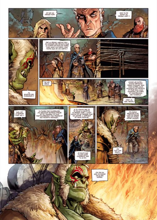 Pour ce qui est déjà la dixième aventure des Orcs et gobelins vivant sur les terres d’Arran, Jean-Luc Istin propose une aventure extrêmement prenante dès les premières pages. En premier lieu, il nous présente un personnage à l’opposé de l’archétype des autres orcs puisque ce dernier n’aime pas la bagarre. Au sang des champs de batailles, il préfère clairement la solitude et la pêche. Ensuite, le scénariste lui met entre les mains une pierre magique qui prédit les futurs décès. Simple prédiction ou possibilité de modifier le cours des choses ? C’est chemin faisant que Dunnrak comprendra clairement son rôle et le destin qui le lie à ce pendentif. Enfin ses pérégrinations vont l’amener à croiser les autres tribus des terres d’Arran (Elfes, nains, humains…) et même des visages connus comme le mage Altherat. On sent que le scénariste déploie quelques éléments pour de futures intrigues. Néanmoins, il est tout à fait possible de suivre et d’apprécier cette aventure même sans connaître tout ou partie des nombreux albums des quatre série-concept dans cet univers. C’est bien simple, ce tome 10 est sans doute le plus intéressant et réussi de toute la série consacrée aux créatures vertes. Et côté dessin, là aussi c’est top ! Alex Sierra (Yôkai, Hel’blar) offre des personnages très charismatiques en commençant par Dunnrak lui-même, des décors fabuleux et très variés et des scènes de combat ultra dynamiques. Le tout est rehaussé par les couleurs expertes de Nanjan. S’il ne fallait lire qu’un seul Orcs et gobelins, ce serait clairement celui-ci !