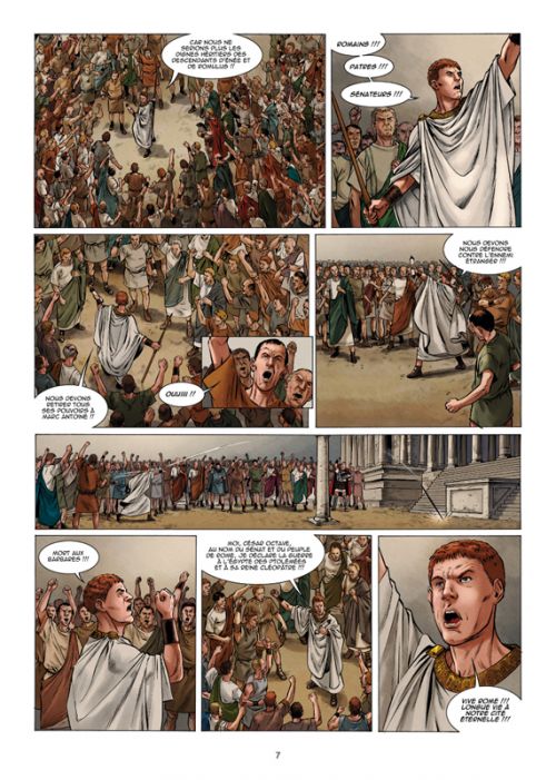 Ce cinquième tome de cette série imaginée par l’auteur et historien Laurent Moënard, aborde la période de trouble de l’après Jules César. Cette époque laisse l’empire Romain exsangue entre, d’un côté, Marc-Antoine et ses frasques avec Cléopâtre, et de l’autre Octave, bien décidé à le faire tomber. Cette série strictement fictionnelle reprend comme toile de fond un évènement marquant de la grande Histoire de Rome. Toute l’intrigue, comme à chaque album, se cristalise autour d’un complot orchestré par les fidèles de cet ordre noir voué à faire tomber l’Empire. Ici, bien sûr, c’est en s’alliant avec Cléopâtre que l’ordre va tenter de réussir son objectif. Ainsi, les évènements chronologiques se déroulent en suivant la véritable histoire de cette guerre entre les légions d’Octave et l’armée de Marc-Antoine. La bataille navale d’Actium reste, entre autre, l’évènement majeur de cette lutte pour le pouvoir. L’auteur ajoute l’intervention des fidèles de l’ordre, à la suite de cette bataille perdue lors de l’invasion des légions d’Octave en Egypte – une action timide qui n’apporte rien de plus au récit. L'évocation de ces évènements est plutôt bien représentée à travers le dessin de Rafa Fonteriz et Fernando Nicolas Baldo. Ils usent d’un trait réaliste, fidèle à la reproduction et la représentation historique des décors et des costumes de l’époque, qu’ils soient égyptiens ou romains. L’approche de cette série au travers de cet ordre caché imaginaire n’est donc pas le plus intéressant. C’est plutôt les faits historiques servant de cadre, qui captent à la lecture.