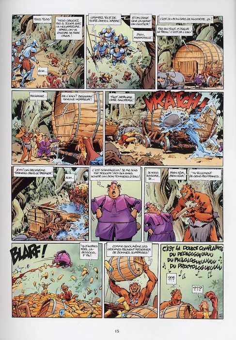 A l’instar des aventures de Lanfeust qui s’appuient sur des quêtes homériques en cycles de 4 tomes, la série Trolls de Troy semble s’installer dans un rythme de one-shots. Servi par le dessin de Jean-Louis Mourier et les couleurs de Claude Guth toujours de bon niveau, ce nouvel épisode impatiemment attendu par les fans se révèle bien meilleur que le précédent. Il faut dire, le challenge abracadabrant des humains est de taille : il s’agit pour eux d’aller innocemment traire la femme enceinte du troll le plus féroce de Troy, Teträm le héros. Tout en évitant de sombrer dans le mauvais goût, Christophe Arleston abuse pour notre plus grand plaisir des caractères stéréotypés de ses personnages, comme le faisait avec délice Goscinny dans son village gaulois. Entre autre, le jeu des charrettes retournées sous lesquelles les trolls se cachent pour circuler en ville est assez bien vu. Bien entendu, sont toujours au rendez-vous : la profusion de jeux de mots à deux centimes d’euro, les incantations magiques à décrypter dans les calligraphies verticales, les décisions ô combien absurdes des héros et quelques détails cachés dans les coins…