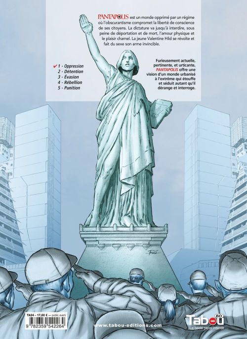Tabou lance une nouvelle série SF X, un peu à l’image de Graph Zeppelin qui multiplie les œuvres du genre science-fiction en ce moment. D’entrée, on sent que l’œuvre n’est pas simplement un prétexte à montrer du sexe. Le texte, abondant, est plein de messages politiques et de revendication. En imaginant une société futuriste à la 1984, l’écrivain italien Thomas Pistoia dénonce les totalitarismes sous toutes leurs formes ; et particulièrement ceux d’extrême droite avec une répression aveugle, des violences racistes ou des lois iniques. Le côté dépaysant des paysages SF tranche avec le côté archaïque de la société qui ne vit que dans l’interdiction. Interdiction de faire du sexe, bien sûr, et c’est là où le porno entre en scène et devient presque un acte de résistance. Jouir pour lutter, c’est un beau message hédoniste. Cependant, d’autres scènes X mettent un peu mal à l’aise et sont cette fois le résultat des tortionnaires de cette dictature. Louer le sexe quand c’est une façon de dire non, pourquoi pas ; mais reluquer des scènes d’orgie ou de viols dans des prisons, c’est un peu plus limite. Le dessin de Walter Trono, froid et lisse, à l’image de ce blanc bleu, sait aussi se faire superbe quand il dessine des corps nus. Gardez toutefois votre pantalon fermé si vous restez à Pantapolis !