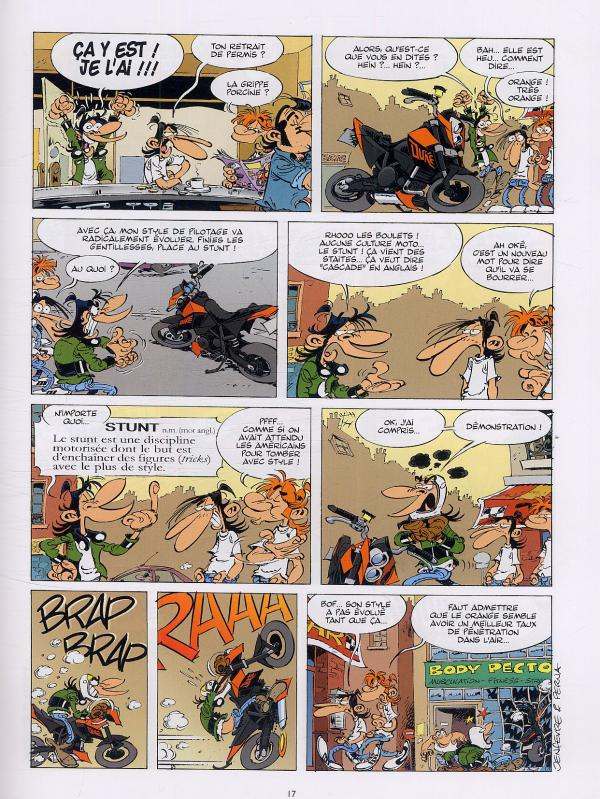 Au Joe Bar, les clients sont le plus souvent des habitués. La majorité a toutefois un point commun : la passion pour la moto. Certes, tous ne sont pas des pilotes émérites, mais peu importe car cela permet d'avoir de beaux souvenirs. Ainsi, lorsque « Ed la poignée » propose à Jéjé l'aspi, Paulo les gaz et Pierrot la fouine de tester sa moto ainsi que celles de Joe et Jeannot, ceux-ci ne cessent d'imaginer que cette proposition cache quelque chose. Une fois les deux-roues démarrés, ils voient effectivement rapidement le piège se profiler : une autre bande de motards les attend de béquille ferme. A par cela, avoir une moto, c'est aussi en prendre soin, la bichonner ou bien sûr tester son futur modèle. Certains les essaient d’ailleurs de manière un peu trop approfondie… En tout cas, pour Jéjé l'aspi, l'étape suivante est la conduite sur piste. Pour cela, il doit suivre un stage de pilotage « compétition », au grand étonnement de ses amis !