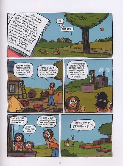 « Depuis que Papa Jacky a arrêté de regarder les séries Z pour les remplacer par le JT de 20h00, c’est la panique à la maison. Rognures d’ongles et cheveux en paquet sur le canapé à l’annonce d’une nouvelle canicule ou des ravages d’un ouragan. La fonte de la banquise, les déchets toxiques, la sécheresse… il se sent tellement coupable que du coup, nous trinquons. C’est décidé, on s’exile à la campagne. Papa a même trouvé une maison. La dernière fois qu’il m’a semblé concevable de pouvoir vivre à la campagne c’est quand l’école nous a fait visiter le Château de Versailles ! Alors quand avec ma sœur Mina, on a vu la photo de sa maison ID-È-ALE, j’ai senti une grosse boule se former au creux de mon ventre. Fermette à rénover, 2 hectares : Bienvenue à Galèreland ! Pour être tranquille… on l’est, et on a de la place. Première bourgade : 3 heures de marche. Poulailler, clapier, écurie, étable (sans oublier la fosse à purin), pas de chauffage central (marrant : on se coupe des tranches de lait gelé). Et puis la nuit c’est top : une petite envie de pipi et hop une ballade nocturne dans le jardin pour 80 m à l’aveuglette. C’est quand même chouette la vraie vie… Mais, il y aura aussi des étés dans notre campagne, des fleurs et des prairies. Et puis, en retroussant un peu les manches, Papa et nous, on la sauvera la planète… »
