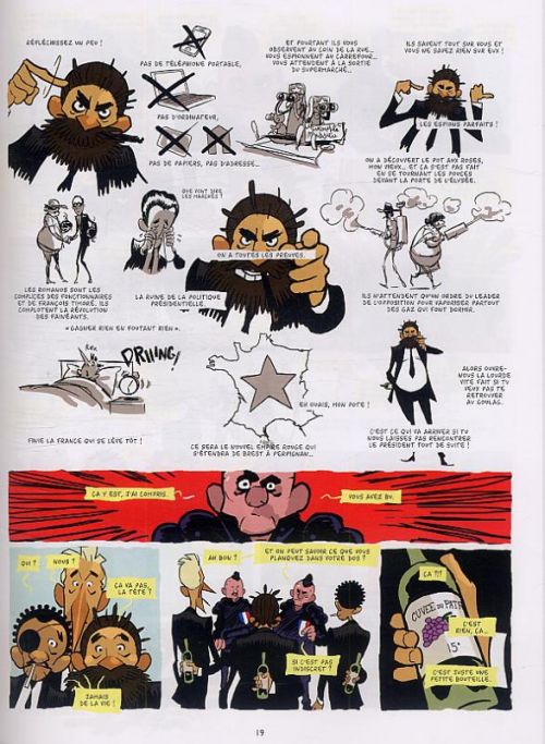 Décidément, Philippe Riche revisite avec talent l’univers des Pieds Nickelés en leur redonnant leurs lettres de noblesse. Pour ce nouvel opus, il surfe sur l’actualité des élections présidentielles avec des personnages politiques criants de vérité en singeant leurs traits de caractère. Il passe au vitriol les principaux thèmes de campagne : les expulsions des étrangers (les Roms seraient en fait des agents secrets roumains qui prépareraient le retour de l’Armée Rouge pour envahir la France, d’où leur expulsion), le nucléaire (les Roms expulsés seraient également des mules qui transporteraient des déchets nucléaires vers leur pays d’origine). Le fonctionnement kafkaïen des partis politiques est passé au crible avec humour (« Chez les Verts, toutes les propositions doivent être débattues devant les militants, puis passer devant un groupe de discussions, puis être validées par les délégués régionaux, avant d’être présentées au conseil national… »). Au rayon dialogue, Philippe Riche nous comble avec son sens du verbe ciselé et incisif. Tout y passe, sans concessions et sans tabou. Il dégomme les discussions de comptoir : « Les bridés, paraît qu’y rachètent tout notre pinard ces enfoirés, faudrait leur envoyer la bombe atomique, ça ferait de la place ». L’auteur y ajoute une dyamique de lecture en multipliant les bulles sur une même case. Le trait de l’auteur, volontiers caricatural, participe à la réussite de cette entreprise (la fraise remplace la rose sur le logo du Parti Socialiste). Bref, un album indispensable pour bien rigoler pendant cette campagne présidentielle (qui nous fait bien rire déjà !).