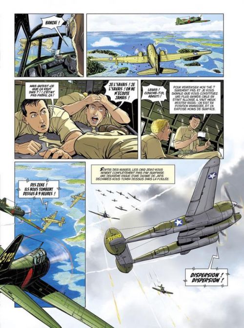Au dessus du Pacifique, un C-47 Dakota transporte son lot de rookies. Parmi eux, des « baby pilotes » tout fraîchement diplômés. L'ambiance dans le coucou est contrastée : certains dorment, d'autres sirotent un kawa. Bonjaski n'en mène pas large : il se demande s'il est à l'abri d'une attaque des Japs, ce qui en fait ricaner quelques-uns. Il faut dire que l'escorte compte ce qu'il faut : à l'avant, des P-38 Lightning ouvrent la voie, flanqués d'un F-4 Corsair de chaque côté de la formation. S'ensuit le transport de troupes, situé au milieu d'une nuée de B-25 Mitchell. D'ailleurs, ce qui inquiète aussi Bonjaski, c'est qu'ils feraient de belles cibles et que le pauvre Dakota est sous-équipé en matière d'armes de défense face aux chasseurs et bombardiers dont il a intégré l'escouade pour ce trajet. Le bonhomme n'est peut-être pas le plus courageux, mais malheureusement, il est assez clairvoyant. Au moment même où il semble résolu à enfin fermer son clapet, une rafale troue la carlingue et trois bastos lui sifflent au dessus du crâne ! Sortis des nuages et surplombant la formation US, cinq zéros déboulent dans leur six heures, suivis la minute d'après d'une dizaine d'autres appareils ! La bataille fait rage et déjà, deux P-38 sont descendus en flammes ! Heureusement, une escadrille de Corsair arrive plein gaz et le surnombre numérique met les japonais en fuite. A bord du Dakota, le bizutage sur le front du Pacifique est rude : un gars est mort, avant même sa première mission. Un autre s'en sortira, blessé à l'abdomen...