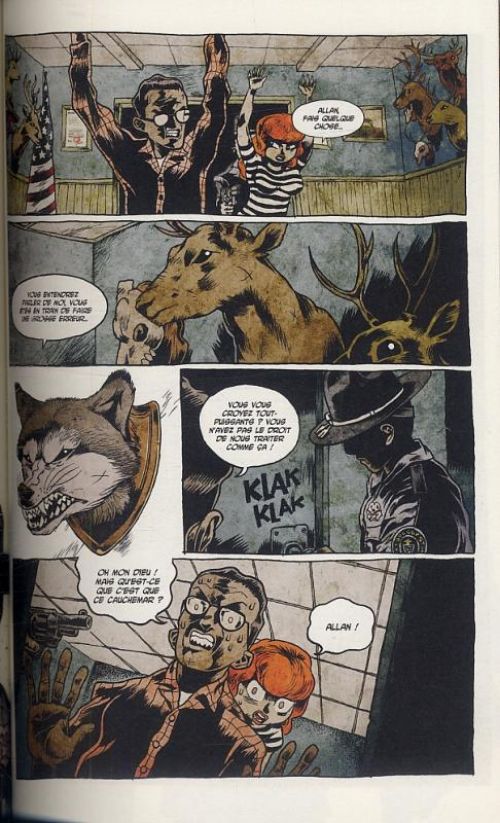 Ce qu'il y a de bien avec Doggy Bags, c'est qu'on s'attend toujours à être déçu et que ce n'est jamais le cas. Après trois volets incontournables, le menu de ce quatrième opus reste d'une efficacité et d'un diversité redoutables. L'album s'ouvre sur [Sélection], une histoire concoctée par El Diablo qui confirme depuis Pizza Roadtrip que l'humour n'est pas la seule corde à son arc. L'histoire débute de façon presque classique, mais verse très vite dans le thriller brutal. La tension entre le vendeur d'armes et son cuisinier atteint un point de non retour qui exige de faire couler du sang ! Cette entrée en matière donne le ton et permet de découvrir le talent de Nicolab, un artiste lyonnais dont on ne devrait pas tarder à (r)entendre parler. Ensuite, c'est au tour du maître de maison, Run, de livrer sa vision de la dame blanche – non, pas la crêpe, mais la légende urbaine. Vous savez, cette femme fantomatique, au bord de la route, qui fait de l'auto-stop et cherche à vous avertir de votre mort prochaine, avant de disparaître... C'est sur cette base que l'auteur de Mutafukaz nous offre une histoire que ne renieraient pas les fans de Massacre à la tronçonneuse. Moins gore, mais dans une ambiance assez similaire, le récit se montre d'une efficacité redoutable. Enfin, Run se met en mode scénariste une nouvelle fois pour Guillaume Singelin. Ensemble, ils revisitent l'assaut des Navy Seals lancé contre Oussama Ben Laden au Pakistan. L'histoire est simple et penche là aussi dans l'épouvante la plus poisseuse. Loin de proposer une approche à la Zero Dark thirty, les deux compères optent pour une histoire rythmée et spectaculaire, l'ultra-violence en prime. Doggy Bags s'installe comme l'incarnation moderne des EC Comics et autres Contes de la crypte d'antan. En plus des trois récits, on constate le soin apporté à l'ouvrage, avec quantité de fausses pubs et articles (plus sérieux) sur les thèmes abordés. Une série d'une régularité et d'une qualité rares. Culte.